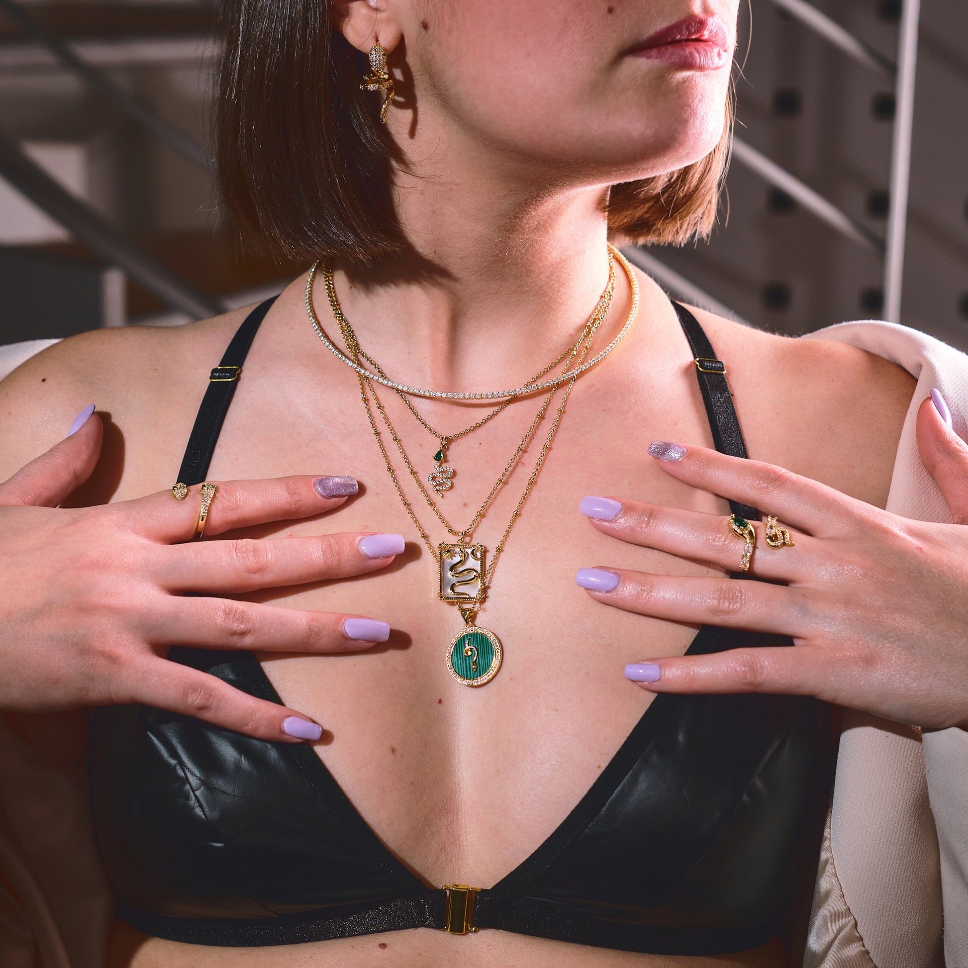 Ciondolo Tag in madreperla con Serpente, sole e luna, con Zirconia Cubica e placcato oro 18k