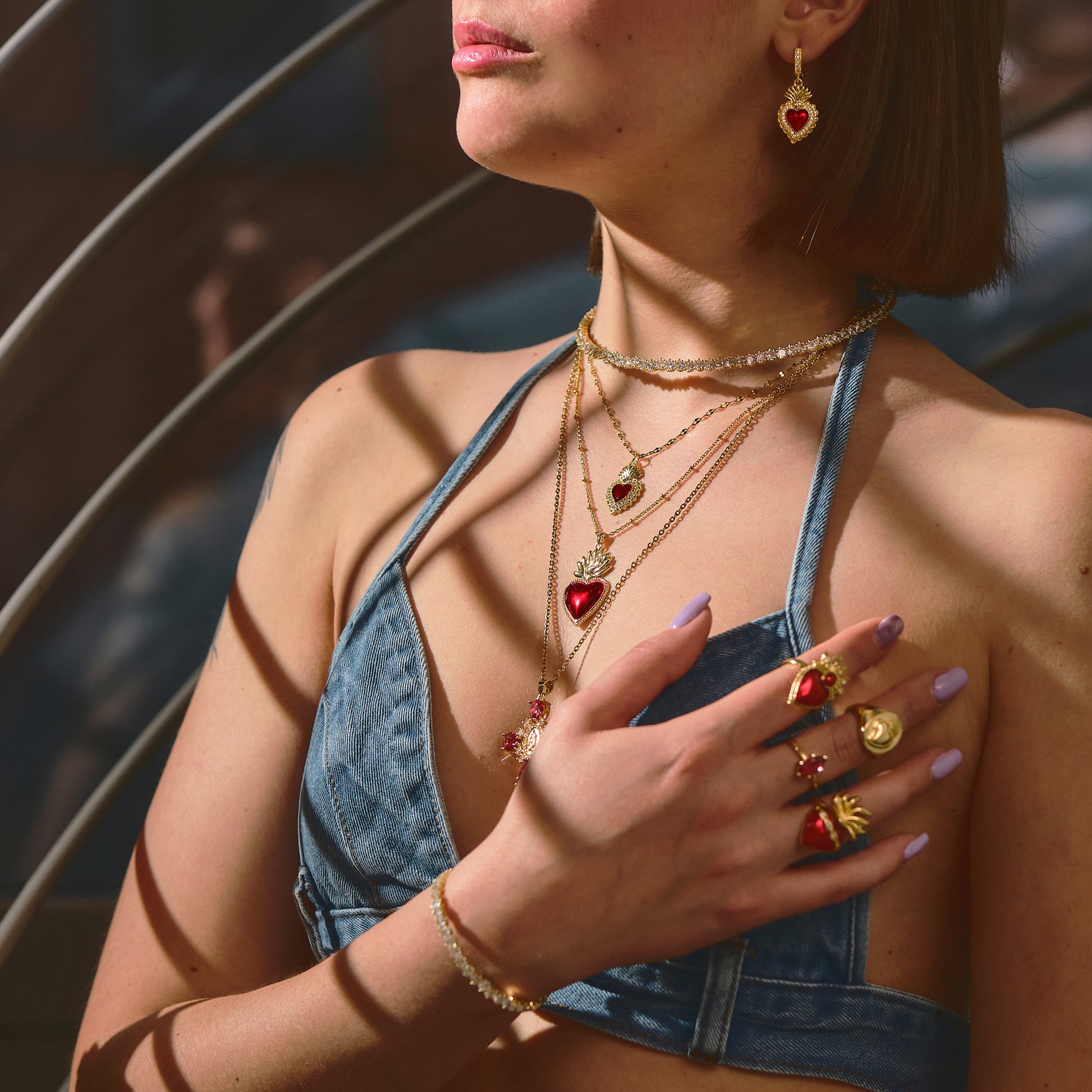 - Catena e ciondolo in ottone placcato oro e smalto rosso