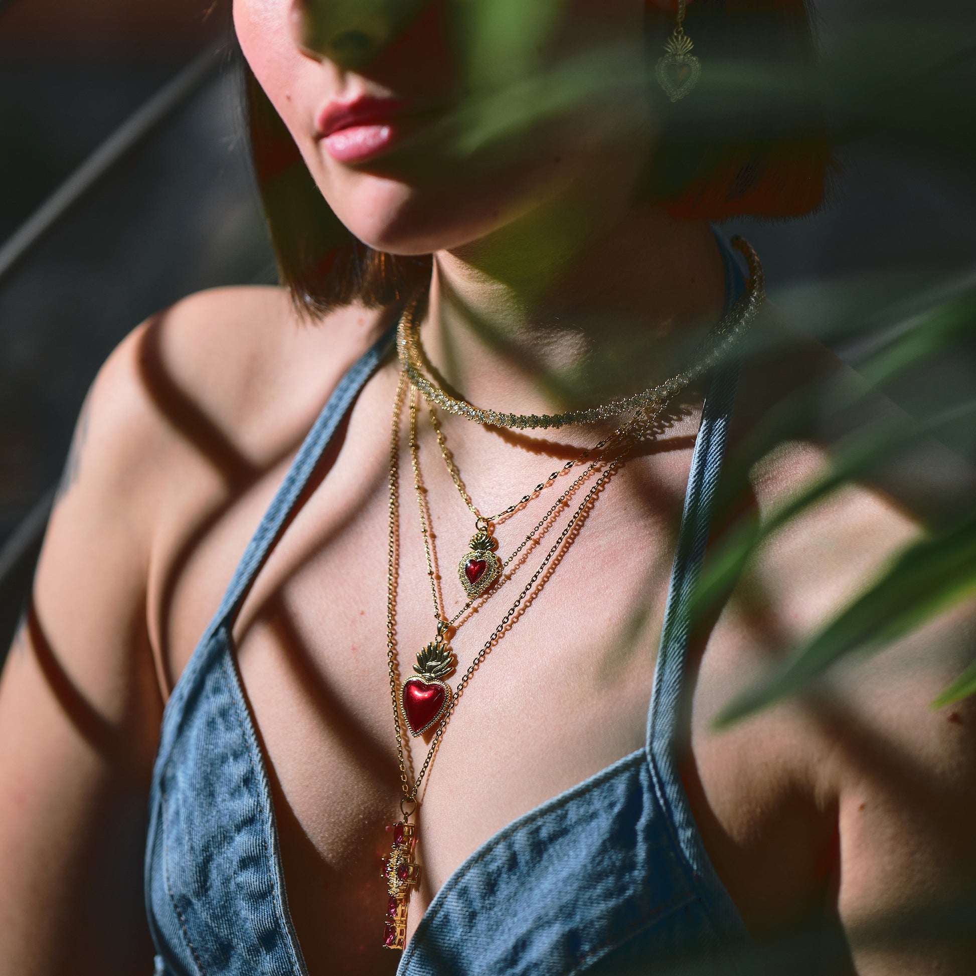 Collana pendente Cuore Sacro / Ex Voto placcata in oro e smalto rosso con contorno in Zirconia Cubica