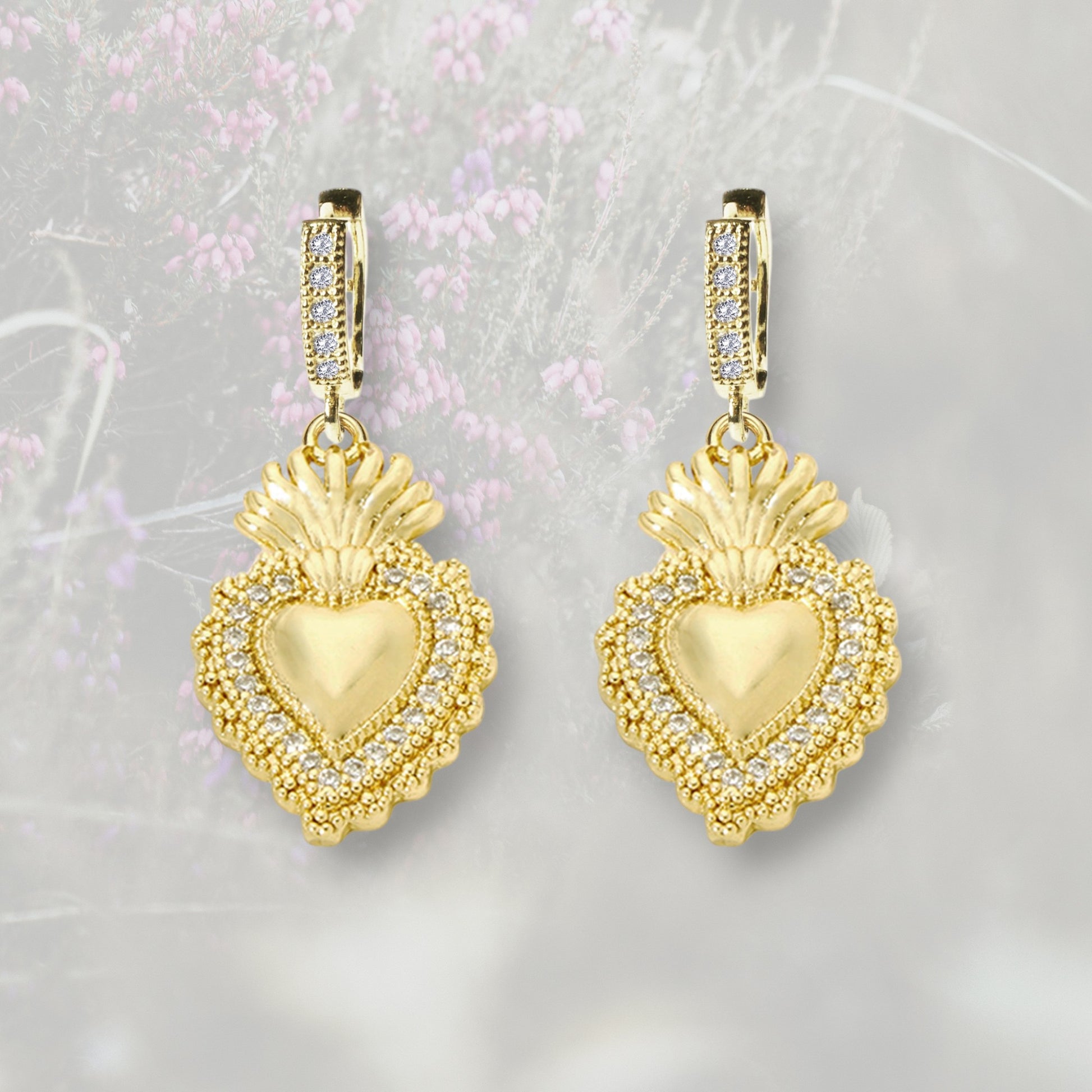 Orecchini a cerchietto con Cuore Sacro / Ex Voto placcati in oro con contorno in Zirconia Cubica