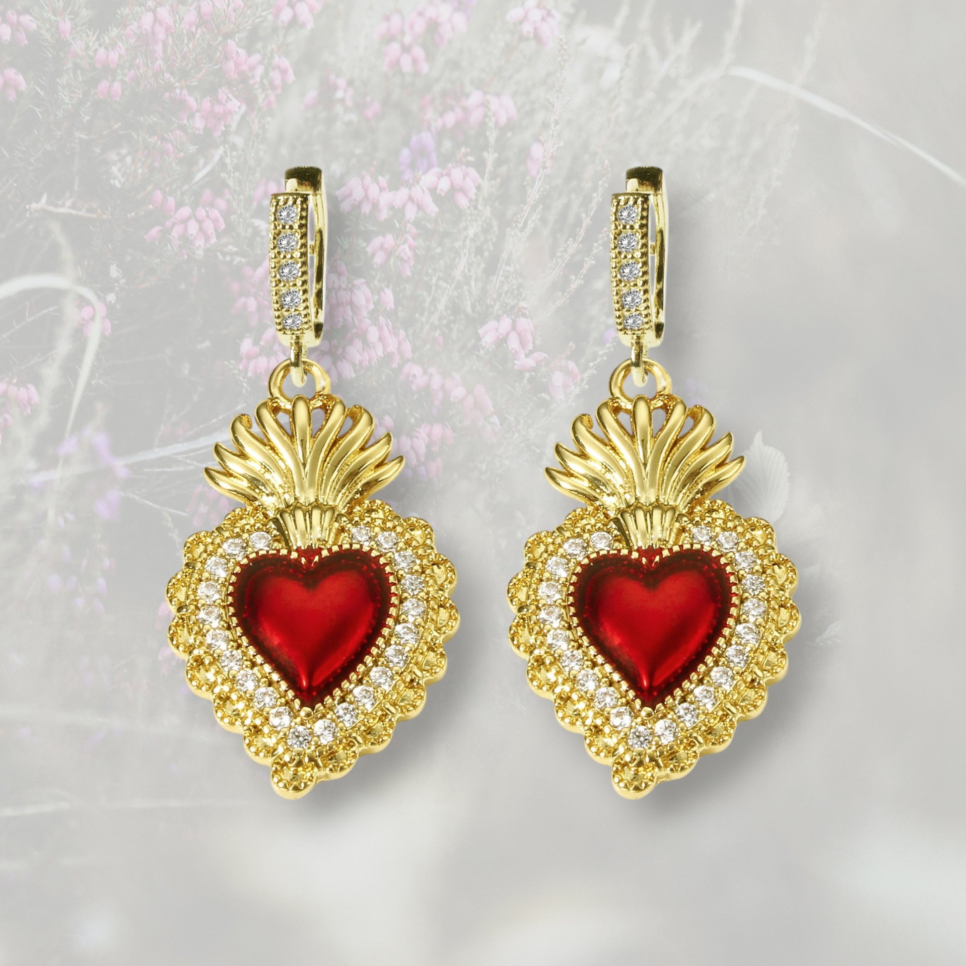 Orecchini a cerchietto con Cuore Sacro / Ex Voto in ottone placcati in oro e smalto rosso con contorno in Zirconia Cubica